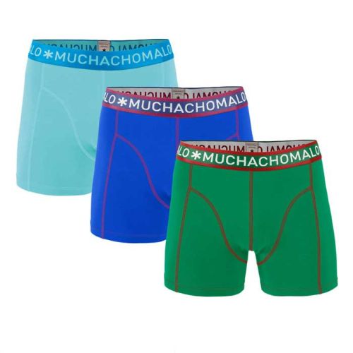 Voordelige set van 3 frisse effen Muchachomalo heren boxershorts. Kleuren blauw, kobalt en groen: mooie basic boxers die je bij elke gelegenheid aan (of uit) kunt trekken!